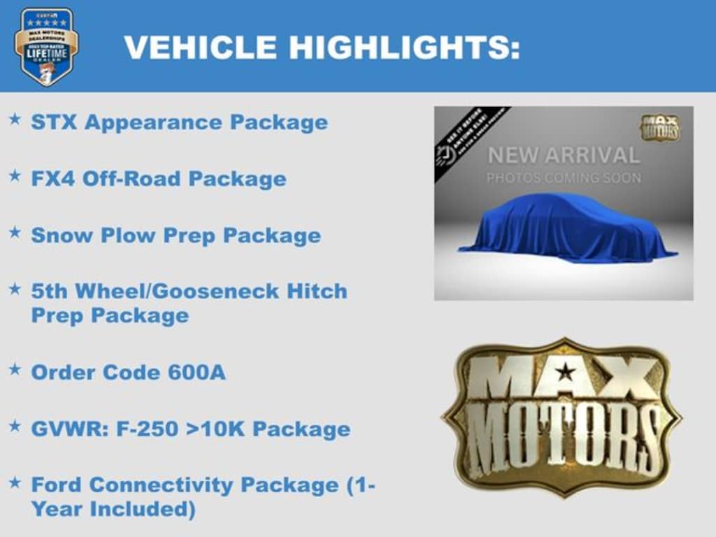 4WD, 17" Argent Painted Steel Wheels, 3.73 Axle Ratio, 5th Wheel/Gooseneck Hitch Prep Package, Body-Color Front Bumper, Body-Color Rear Bumper, Cloth 40/20/40 Split Bench Seat, Color-Coordinated Full Carpet with Floor Mats, Engine Block Heater, Ford Connectivity Package (1-Year Included), FX4 Off-Road Package, GVWR: F-250 >10K Package, HD Vinyl 40/20/40 Split Bench Seat, Hill Descent Control, Internet access capable: 5G Modem - Ford Connectivity Package, LED Box Lighting, LED Fog Lamps, LED Roof Clearance Lights, Off-Road Specifically Tuned Shock Absorbers, Order Code 600A, Painted Grille, Platform Running Boards, Radio: AM/FM Stereo with MP3 Player, Snow Plow Prep Package, STX Appearance Package, SYNC 4, Tailgate Step and Handle, Trailer Brake Controller, Unique FX4 Off-Road Box Decal, Wheels: 18" Ebony Black Painted Aluminum.