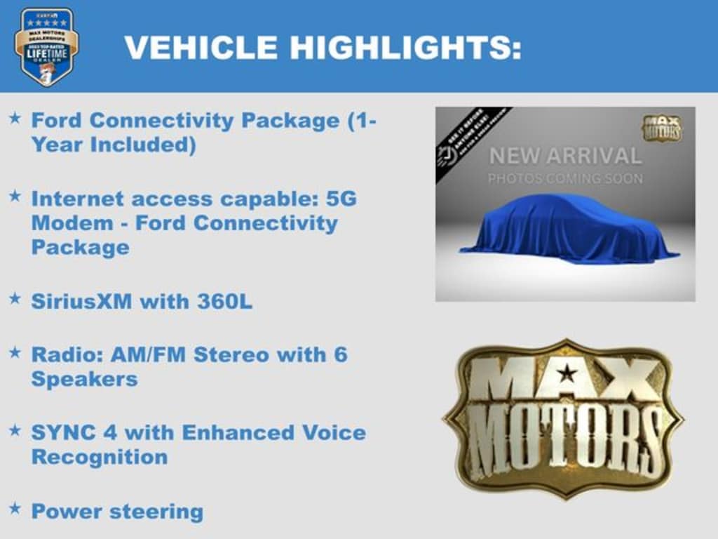 Alloy wheels, Apple CarPlay/Android Auto, Auto High Beams, Auto High-beam Headlights, Brake assist, Bumpers: body-color, Compass, Driver door bin, Driver vanity mirror, Electronic Stability Control, Exterior Parking Camera Rear, Ford Connectivity Package (1-Year Included), Four wheel independent suspension, Front Bucket Seats, Front Center Armrest, Front reading lights, Illuminated entry, Internet access capable: 5G Modem - Ford Connectivity Package, Lane-Keeping System, Outside temperature display, Overhead console, Passenger door bin, Passenger vanity mirror, Power door mirrors, Power steering, Pre-Collision Assist with Automatic Emergency Braking, Radio: AM/FM Stereo with 6 Speakers, Rear seat center armrest, Rear step bumper, SiriusXM with 360L, Steering wheel mounted audio controls, SYNC 4 with Enhanced Voice Recognition, Telescoping steering wheel, Tilt steering wheel.