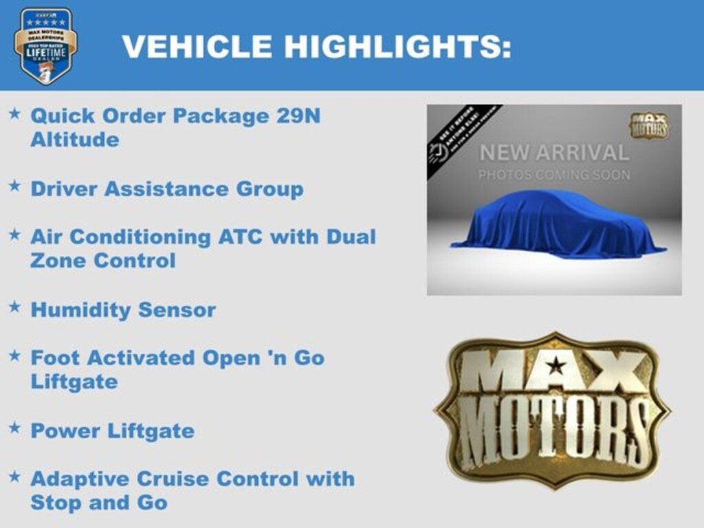 4WD, 10.1" Touchscreen Display, 2nd Row USB Type A/C Charge Only, Adaptive Cruise Control with Stop and Go, Air Conditioning ATC with Dual Zone Control, All-Season Floor Mats, Altitude Special Edition, Auto-Dimming Rear-View Mirror, Black Day Light Opening Moldings, Convenience Group, Driver Assistance Group, Foot Activated Open 'n Go Liftgate, Front License Plate Bracket, Gloss Black Surround/Neutral Gray Rings, Heated steering wheel, Humidity Sensor, Neutral Gray Exterior Badging, Piano Black Interior Accents, Power 2-Way Driver Lumbar Adjust, Power Adjust 8-Way Driver Seat, Power Liftgate, Premium LED Fog Lamps, Quick Order Package 29N Altitude, Rain Sensitive/Intermittent Wipers, Sliding Sun Visors with Illuminated Mirrors, Wheels: 18" x 7" Gloss Black Painted Aluminum, Windshield Wiper De-Icer, Wireless Charging Pad.