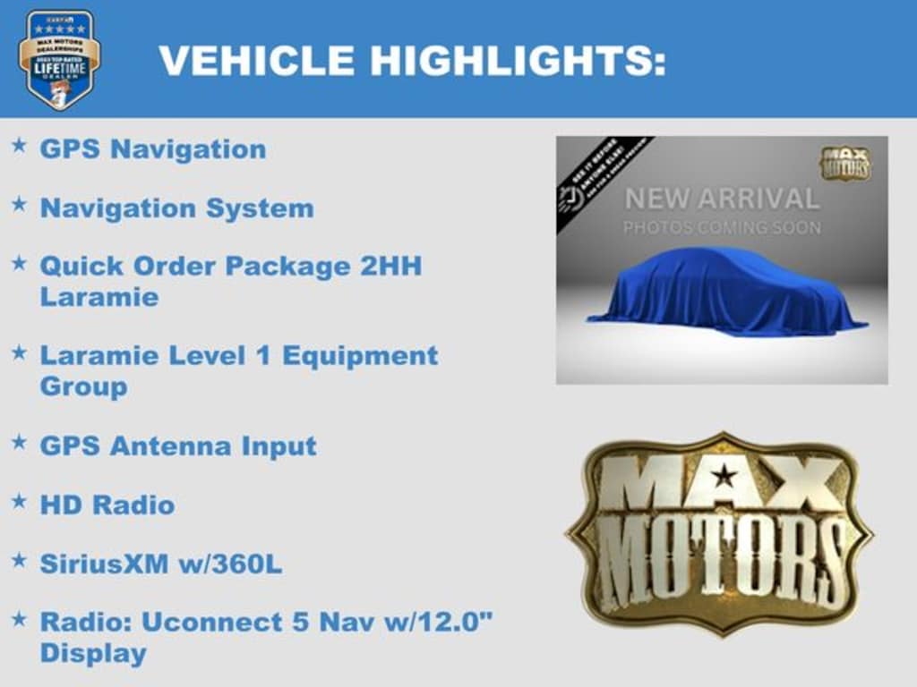 12" Touchscreen Display, 2nd Row In Floor Storage Bins, 4G LTE Wi-Fi Hot Spot, Alexa Built-In, Apple CarPlay, Auto Adjust In Reverse Exterior Mirrors, Auto Dim Exterior Mirror, Auto High Beam Headlamp Control, Auto Power-Folding Mirrors, Auto-Dimming Exterior Passenger Mirror, Blind Spot & Cross Path Detection, Center Hub, Chrome Exterior Mirrors, Connected Travel & Traffic Services, Connectivity - US/Canada, Disassociated Touchscreen Display, Exterior Mirrors Courtesy Lamps, Exterior Mirrors w/Heating Element, Exterior Mirrors w/Memory, Exterior Mirrors w/Supplemental Signals, Foam Bottle Insert (Door Trim Panel), For Details, Visit DriveUconnect.com, For More Info, Call 800-643-2112, Forward & Reverse Utility Lights, Front LED Fog Lamps, Global Telematics Box Module (TBM), Google Android Auto, GPS Antenna Input, GPS Navigation, HD Radio, Integrated Voice Command w/Bluetooth, Laramie Level 1 Equipment Group, LED Reflector Headlamps, LED Tail Lamps, Mirror Running Lights, Navigation System, Off-Road Information Pages, ParkSense Front/Rear Park Assist System, Power Adjust Mirrors, Power Adjustable Convex Aux Mirrors, Power Adjustable Pedals w/Memory, Power Heated Fold Telescopic Mirrors w/Memory, Power Telescoping Mirrors, Quick Order Package 2HH Laramie, Radio: Uconnect 5 Nav w/12.0" Display, Rain Sensitive Windshield Wipers, Rear Power Sliding Window, Rear Window Defroster, Remote Tailgate Release, Selectable Tire Fill Alert, SiriusXM Radio Service, SiriusXM w/360L, Trailer Tow Pages, Wheels: 18" x 8.0" Polished Aluminum.